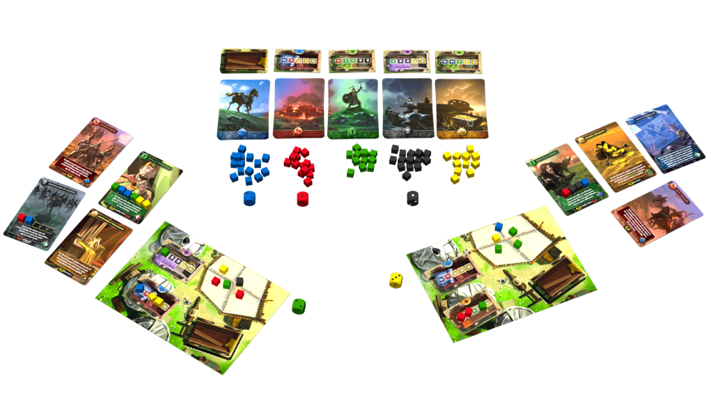 L’objectif étant de remplir des chariots avec des ressources ou de donner les ressources à des mercenaires pour obtenir leur aide. Mais me dites vous ? on joue tout seul dans son coin ? NON !!! Il y a une forte interaction sur le choix des dés (pour embêter les autres) et sur le placement des fléaux (certaines cartes piochées sont très bonnes pour soi ou très mauvaises pour les autres hahaha). On peut poser les fléaux devant un joueur qui devra désactiver  le fléau (en donnant des ressources) avant de pouvoir continuer son jeu de remplissage et de recrutement. Quel vilain cet auteur ! Mais quel plaisir quand ça tombe pas sur vous hahahaha