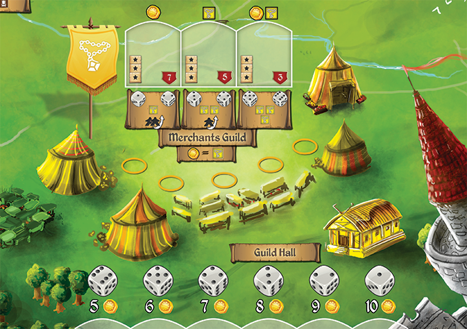 • 2 lieux spéciaux : Berk the Clerk (pour bénéficier d’une modification de dé) et le château blanc de la reine (pour gagner en réputation),