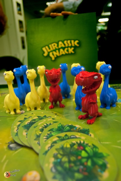J’ai raté les 5 parties simultanées de Bruno contre 5 joueurs (ou 4? je ne me souviens pas). Mais quel plaisir d’y jouer. Le jeu se présente sous la forme d’un échiquier sur lequel quelques cases ont des oeufs de 2 couleurs différentes (pour 2 joueurs). On placera les diplodocus de la même couleur sur les oeufs et sur les autres cases on y mettra des tuiles cachées. Mais vous savez les diplo sont gentils (j’allais dire diplomates lol) donc ils ne mangent que de l’herbe représentées par les tuiles cachées. Quand un diplo se déplace il mange l’herbe et donc la tuile est révélée puis donnée à son propriétaire (des points de victoires, des actions spéciales…). Celui qui a le plus de points gagnent. Ca c’est pour leurs joueurs , mais pour les tarés comme nous, parmi les actions spéciales il y a la sortie des T Rex  qui n’appartiennent à aucun joueur mais qui peuvent être joués quand c’est leur tour. Et les T Rex ben ils bouffent les diplo ! et si votre adversaire n’a plus de diplo, ses PV servent à rien … pauvre chou…. vous avez gagné mouahahahahaha