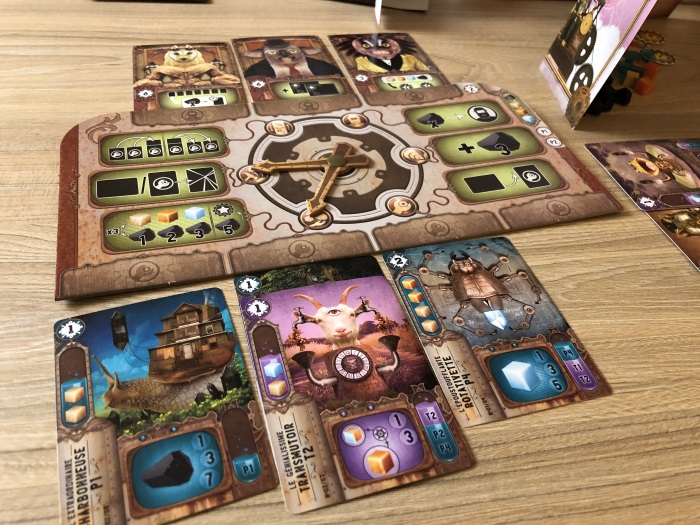 Mais revenons donc au matériel. Le moins que l’on puisse dire c’est que Bombyx a mis le paquet sur le look Steampunk onirique. Tout y est ! Les machines toutes plus extravagantes les unes que les autres, les personnages lookés aux noms alambiqués et des animaux anthropomorphes (dont certains me mettent assez mal à l’aise je dois l’avouer). Sans parler de la dentition en plein milieu du plateau !!!