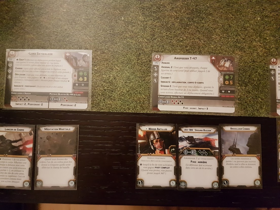 1 La Phase de Commandement : Chaque joueur choisit secrètement une de ses cartes de commandement disponibles. Chacun la révèle en même temps. Celui ayant jouer celle avec le moins de points lumineux débute le round. Pour cela, il désigne son commandant (Dark Vador pour l’Empire ou Luke Skywalker pour les Rebelles) et pose autant de jetons « ordre » faces visibles auprès ses unités armées éligibles que de points lumineux sur sa carte de Commandement. Pour qu’une unité soit éligible, elle doit être à une distance maximale de 3 (sur un maximum de 4) du Commandant. Les jetons « ordre » non attribués forment une pioche faces cachées.