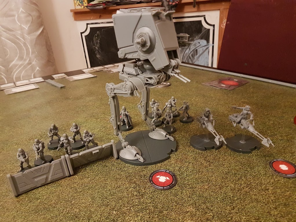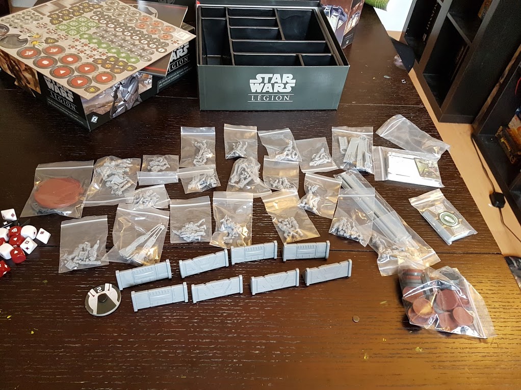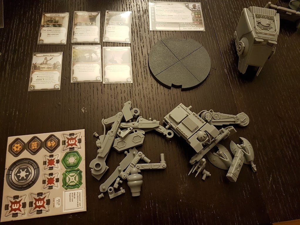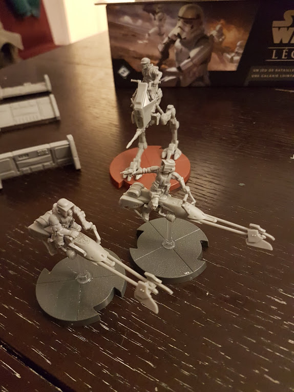 Ainsi, en ouvrant la boite de Star Wars Legion, on découvre les figurines à assembler de 14 Stormtroopers, 14 Soldat Rebelles, 2 Speeders Bikes 74-Z et 1 LT-TT. En exclusivité, Dark Vador et Luke Skywalker sont inclus et ne seront pas disponibles autrement. La boite renferme également 8 barricades, 15 dès, 3 gabarits de déplacement, une grande réglette pour mesurer la portée des attaques, des cartes et des jetons en tout genre. Il m’a fallu environ 3 heures pour assembler toutes ces figurines (mais je ne suis sans doute pas une référence en la matière ! 😉 ). J’ai eu du mal avec les Speederbikes mais j’ai fini par y arriver, ce qui est bon signe. J’ai été très surpris par la facilité de l’assemblage de TR-TT qui a vraiment été bien plus rapide que je ne l’aurais pensé pour un résultat impeccable !
