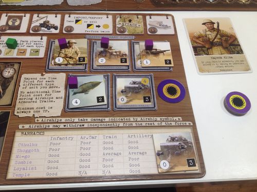 Les actions possibles sont assez classiques : construction de rails, fermes, extraction minière, vente de ressources, construction d’unités de combat (infanterie, artillerie, trains blindés, zepelins…), achat de cartes d’assistants (très précieuses, comme toujours).