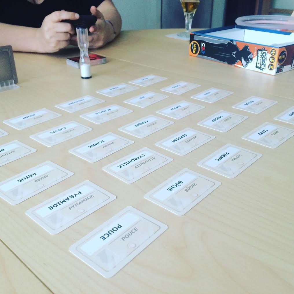 Agréablement surprise par la version duo (et pas duel puisque c’est un coop). J’aime beaucoup la version en équipe mais je dois admettre que la version Duo est très réussie, voire même meilleure que la version de base. Chaque joueur dispose de mots à faire deviner parmi ceux sur la table. Les joueurs peuvent avoir des mots en commun. 3 assassins se cachent derrière certains mots. Un assassin de l’un des joueurs peut être un mot à faire deviner pour l’autre ce qui réduit un peu le risque héhé La particularité de cette version duo est qu’on dispose de jetons temps. Si un joueur cible une carte mot qui est « neutre » (carré blanc sur l’image ci-dessous), on perd un jeton temps. Et les jetons temps sont perdus à chacun des tours aussi. Ca va donc très vite !!!
