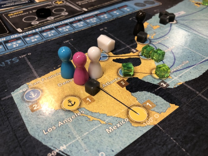 Encore 2 parties d‘Alien Frontiers ce mois-ci, je ne m’en lasse pas, pourtant il n’a rien de spécial. C’est un jeu de pose d’ouvriers (des dés), tout ce qu’il y a de plus classique mais la durée de partie est telle que la course demande une revanche ! L’objectif est de gagner le plus de points et vous gagnez vos points grâce au placement de vos colonies + vos cartes Aliens + la majorité de vos colonies sur les quartiers etc. Pour obtenir ces points, vous placez vos dés (vaisseaux) sur des emplacements vous permettant de faire des actions : récupérer du carburant, construire vos colonies et les placer, récupérer des cartes Aliens, voler les adversaires, construire d’autres vaisseaux… L’essence du jeu est dans la course. Ici on ne prend pas le temps de se développer, faut aller vite sinon les autres passeront devant vous. J’aime ce type de jeu car c’est court et on passe pas 10 tours à essayer d’optimiser les 10 prochains. C’est simple, rapide, terriblement bien équilibré, joli et jouissif quand on pose sa dernière colonie (ça met fin à la partie et on compte les points).