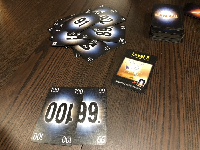 Dans la même gamme que The Game, The Mind, jeu coop, propose aux joueurs de tenter de gagner en niveau / level… Pour cela, chaque joueur reçoit autant de carte que le level dans lequel se trouve les joueurs. Au level 1, vous aurez donc chacun 1 carte. Les cartes sont numérotées de 1 à 100. Il va falloir que les joueurs, sans parler ni mimer ni siffler… posent les cartes dans l’ordre croissant ! Si vous avez le un, vous le posez donc immédiatement et très vite, si vous avez le 100, vous attendez que tous aient posé leur carte. Mais entre les deux… il y a du challenge !!! On est arrivé jusqu’au niveau 5 en oubliant qu’on pouvait utiliser les bonus, car de niveau en niveau vous obtenez quelques jockers évidemment.