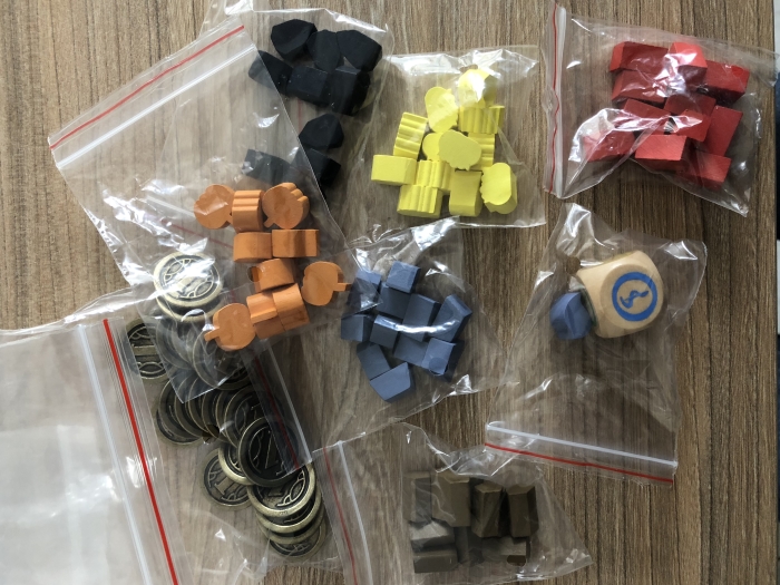 - des cylindres en bois à leur couleur (l’influence) + un jeton en bois pour le score