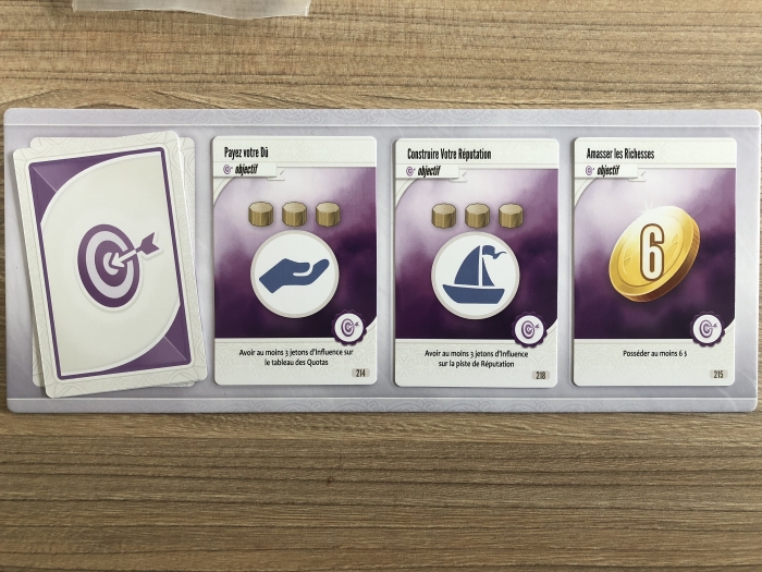 Objectifs communs : avoir 3 influences sur les offrandes au roi (port des nuages ils appellent ça c’est beau, 3 influences sur la réputation, avoir 6 pièces d’or)