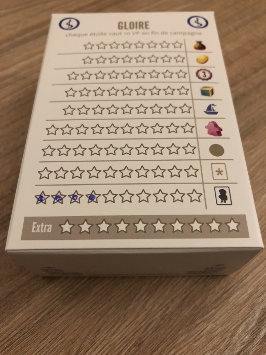 ici le joueur bleu a coché 4 étoiles de gloire en espérant vite atteindre le bonus qui permet en début de partie de choisir un second personnage c’est à dire une seconde faculté pour mon personnage