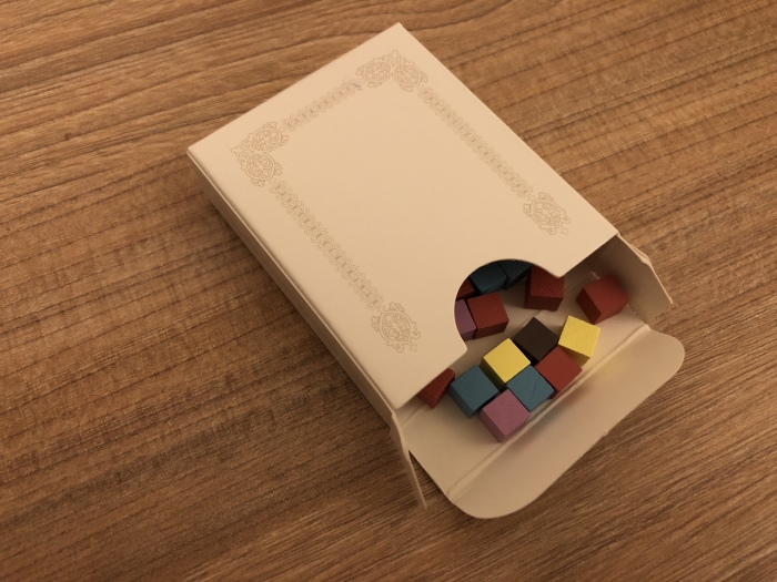 - les cartes nous dévoileront aussi la prise de risques via des cubes de différentes couleurs qui vont représenter les bandits, la famine etc. Ces prises de risques seront aléatoirement mises sur les bâtiments et le premier arrivé récupérera le risque (le cube) et pourra l’échanger grâce à de nouveaux bâtiments. En gros, c’est un cadeau contre la prise de risque qui ne se matérialise pas encore (ou pas du tout de la campagne ? on ne sait pas). les prises de risques nous ont fait ouvrir l’une des 3 dernières boites du jeu.
