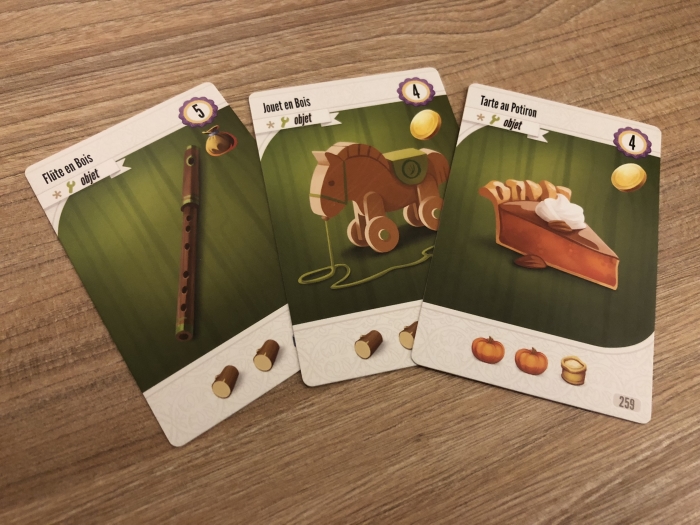 - les cartes objets qui nous permettent d’avoir des PV et quelques bonus lorsqu’on défausse les ressources demandées