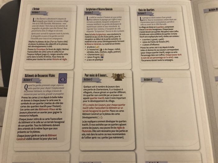 Sur les premières cartes, vous allez lire l’histoire et retirer leur sticker pour le coller sur le livret de règles, à la page histoire.