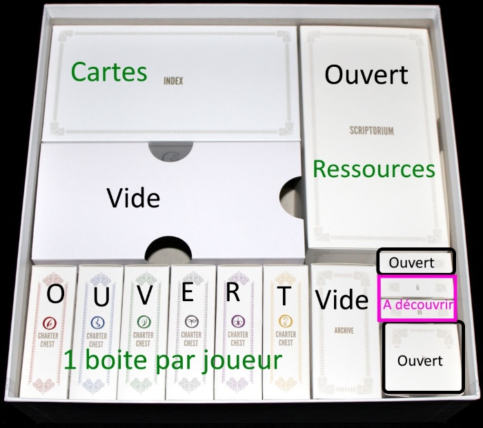 - les cartes personnages dévoilées lors de l’ouverture des caisses sont à mettre dans notre boite pour la prochaine partie).