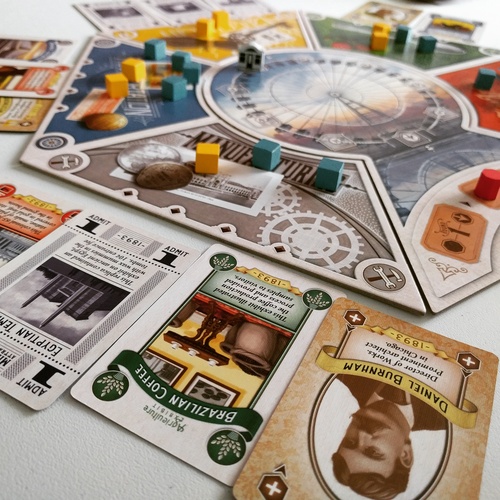 Ah, Exposition Universelle ! Que dire ? C’est un jeu auquel il faut jouer plusieurs fois pour apprécier son originalité. Un jeu de majorité dans un thème que j’apprécie particulièrement. En plus, sur chacune des cartes est expliquée l’exposition, je m’y perds dans la lecture 🙂 Ce jeu, on aime ou on déteste par contre. Et moi j’ai aimé. A votre tour, vous choisissez une catégorie (transports, agriculture…) sur laquelle vous posez un de vos cubes et vous prenez les cartes. Les cartes sont des cartes d’expositions, de visiteurs, de personnalités… Une fois qu’il y a eu assez de visiteurs, on regarde qui est majoritaire dans chacune des catégories. Les majorités permettront d’avoir des points et de valider les expositions. Plus vous validez d’expositions dans différentes catégories, plus vous gagnez des points en fin de partie. J’aime beaucoup le thème, les idées, les visiteurs. J’aime les jeux de majorité donc ca colle parfaitement avec ma gamme, même si ce n’est pas un jeu expert.
