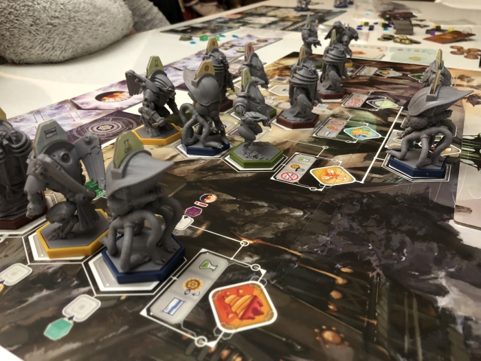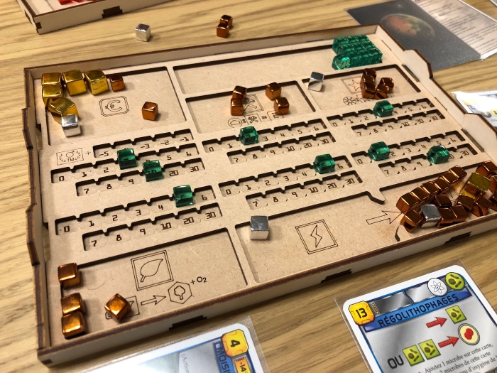 J’avais envie d’un gros jeu et tout le monde parlait de Terraforming Mars. Patrice me l’a donc fait découvrir. Je m’attendais à un jeu de cartes. Ce fut le cas. J’ai passé un superbe moment, pourtant moi et les cartes ça a toujours été compliqué. Mais il y a de la gestion, de la « conquête » de Mars, des pouvoirs à activer etc… Je l’ai trouvé parfait ce jeu. Par contre, plus j’y pense et moins j’ai envie d’y rejouer. Je le trouve très long pour ce qu’il propose en fait. Les qualités sont là mais je suis mitigée. Le draft des cartes est vu et revu. Ceci dit, j’ai particulièrement aimé la progression dans le jeu et dans l’habitabilité de Mars : les animaux qui arrivent quand l’oxygène atteint un certain niveau etc… J’ai trouvé le thème vraiment sympa mais la mécanique me laisse sur ma faim même s’il y a de très bonnes idées. Les goûts et les couleurs… En tous les cas, j’y aurai joué au moins une fois et le matos de Broken Token est juste énorme !