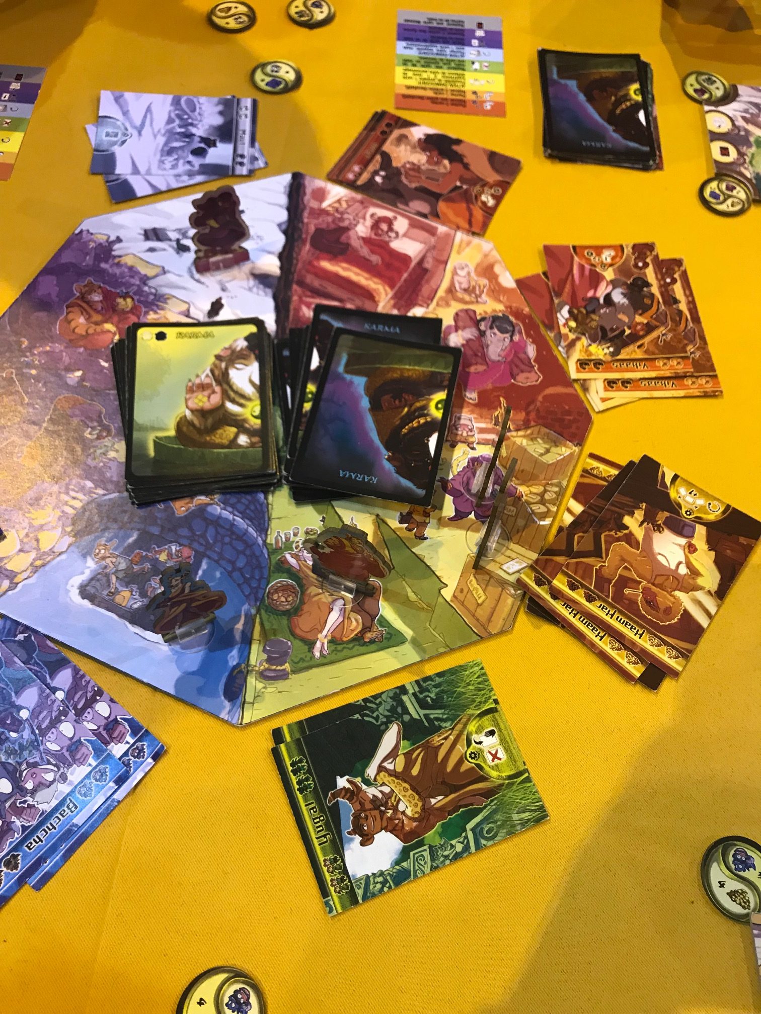- Enfin, on va pouvoir faire une action au choix! Soit on joue une carte de sa main pour son action (il y a 8 cartes différentes) soit on prend une amulette en utilisant les symboles des cartes . Il est ici possible d’utiliser des bons et des mauvais karmas pour compéter la combinaison mais attention! Chaque mauvais Karma utilisé assombrira sa vie future…