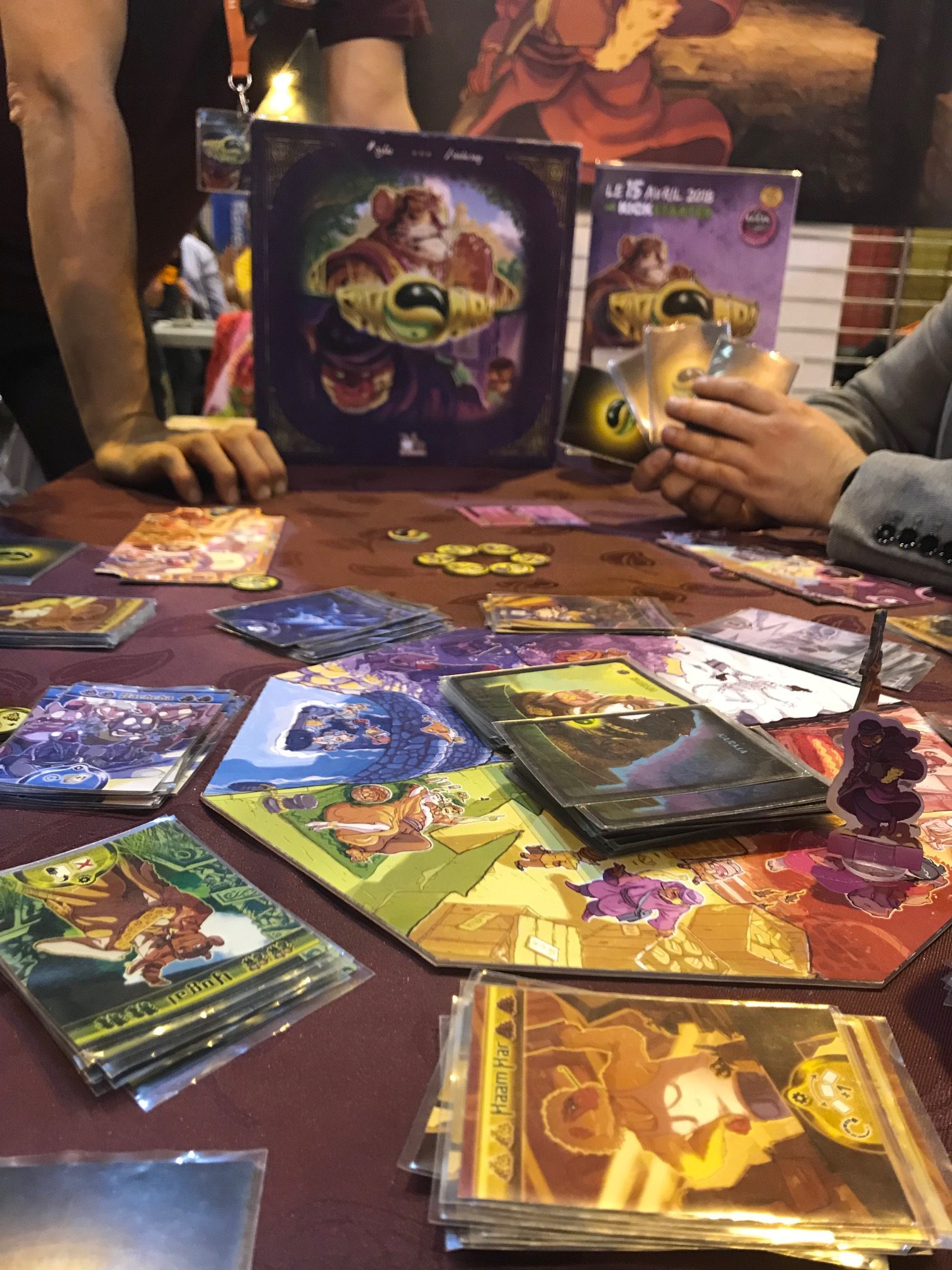 C’est au festival de Toulouse que j’ai pu tester Samsara! Il faut dire que l’équipe de Oka Luda (nouvelle société d’édition) avait bien fait le choses en proposant un très joli décor qui invitait déjà au voyage! En me rapprochant un peu j’ai rencontré une équipe souriante et dynamique toujours prête à expliquer et faire découvrir le jeu! Et je peux vous dire qu’ils n’ont jamais décroché ce sourire de tout le week end malgré les multiples joueurs et explications de règles! Oui parce qu’il faut le dire les tables ont été pleines tout le week end chez les périgourdins! Et les joueurs sont toujours repartis avec le sourire et avec l’intension de pledger! Est ce à cause du bon Karma dégagé par ce jeu? Le mystère reste entier!