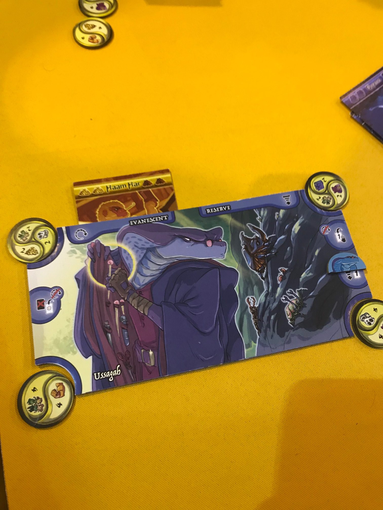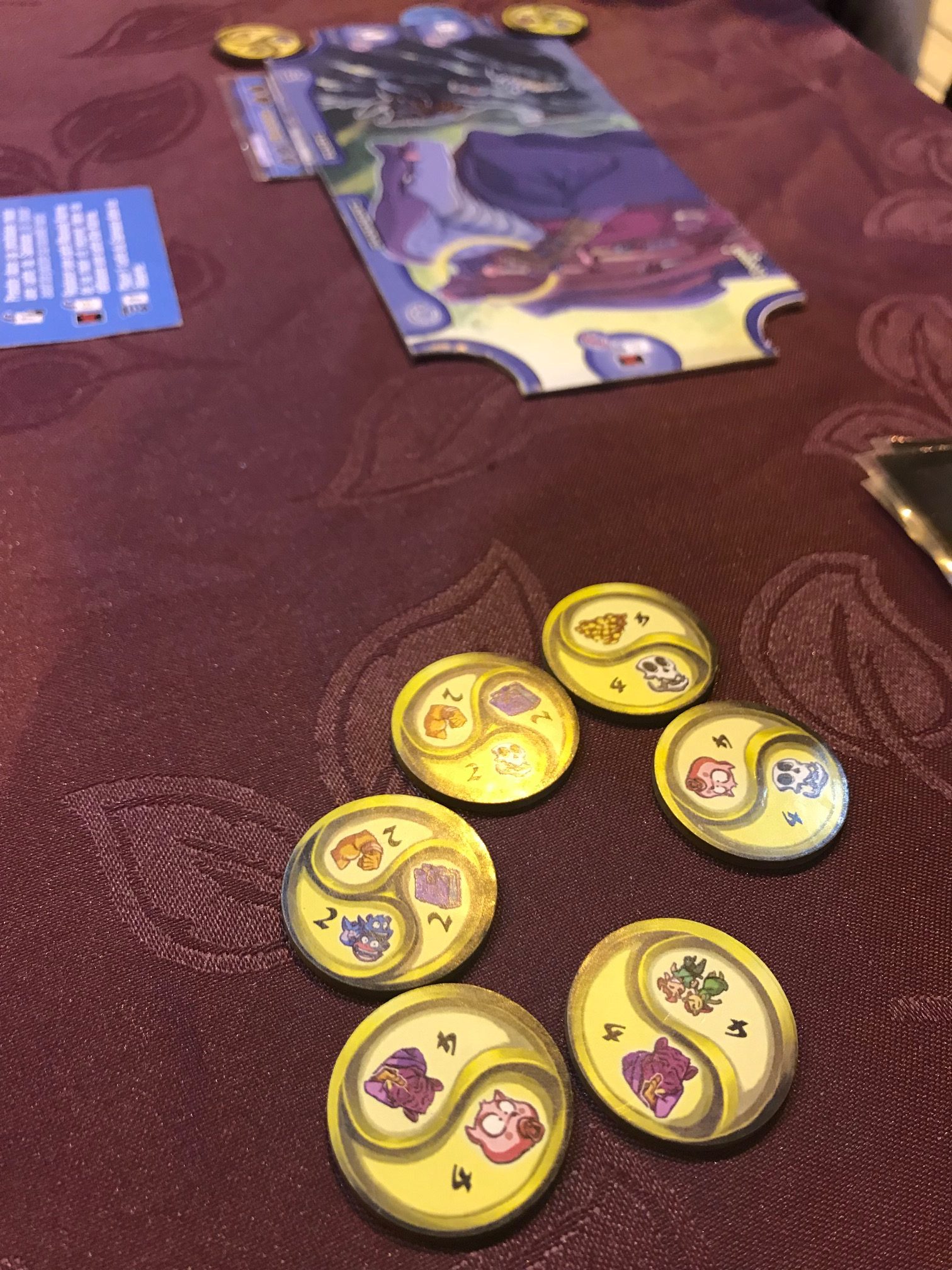 Enfin, on dépose 5 amulettes entre chaque adversaires. Chaque amulette représente de symboles qu’il faudra défausser en une seule fois pour réclamer l’amulette. On attendra en effet le Nirvana en collectant 5 amulettes!