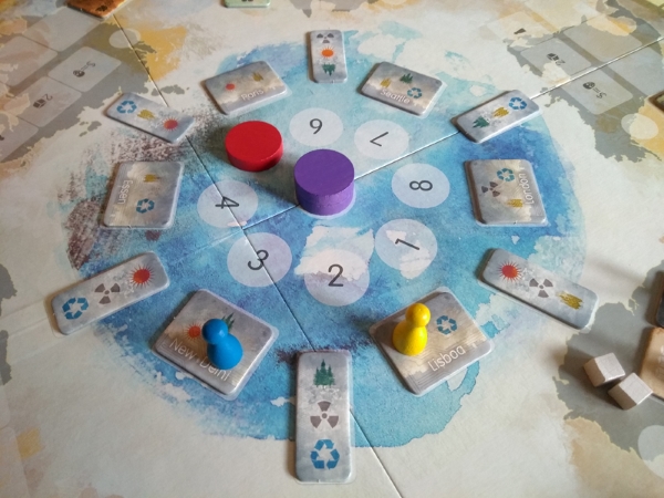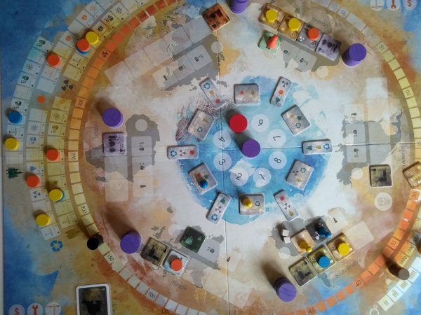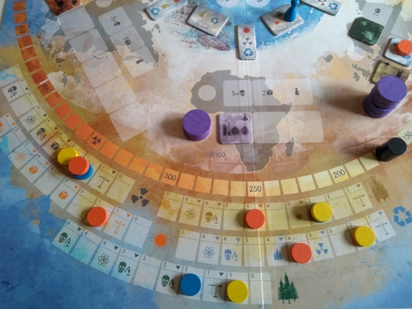 Chaque région qui n’aura pas sa nouvelle centrale à énergie verte au début de la décennie en cours reçoit une horrible centrale à énergie fossile, qui fait augmenter le taux de pollution de la planète (de 20, 30 ou 40). S’il atteint 500, tout le monde a perdu. A la fin des 5 décennies, ou si toutes les régions n’ont plus que des centrales à énergie vertes, ou si on redescend sous 350 de niveau de pollution, le décompte des points a lieu pour déterminer le vainqueur.