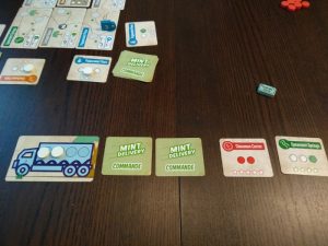Mint Delivery est un jeu « pick up and deliver » (comprenez charger et livrer) idéal pour comprendre le principe et travailler sa technique. Dans cette toute petit boîte on trouve des jolies pastilles, des cartes plan qu’on installe, des cartes commandes et de magnifiques petits camions.