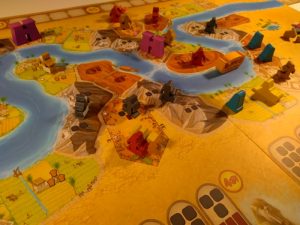 Là encore c’est un jeu familial+, peu complexe. L’aléatoire du tirage des ouvriers peut gêner mais c’est l’occasion de travailler l’optimisation des ressources. L’interaction tient à la concurrence sur les ouvriers, les cartouches de construction et les emplacements de construction, qui se raréfient au fur et à mesure. La partie dure 1h à 4.