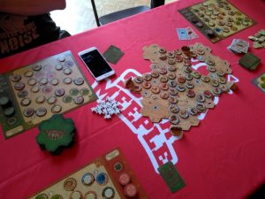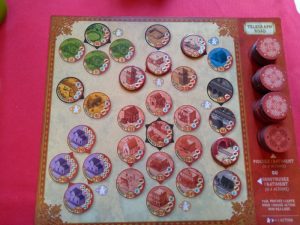 Le placement d’un ouvrier sur une cité permet enfin de récupérer deux cartes Bonus. Le joueur en garde une et doit en donner une à un autre joueur, éventuellement avec contrepartie s’il est habile négociateur.