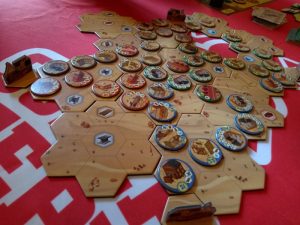 Evidemment, il y a une contrainte de pose : il faut toujours être adjacent à soi-même, sinon ça coûte des ressources en plus. Le jeu consiste donc à avancer en gênant les autres et à ne pas se faire encercler.