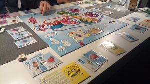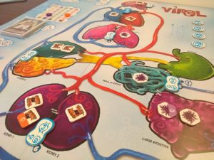 La mécanique est simple : c’est un jeu de programmation et de majorité avec un thème qui fonctionne bien : la multiplication et la circulation de virus dans les organes du corps humain.