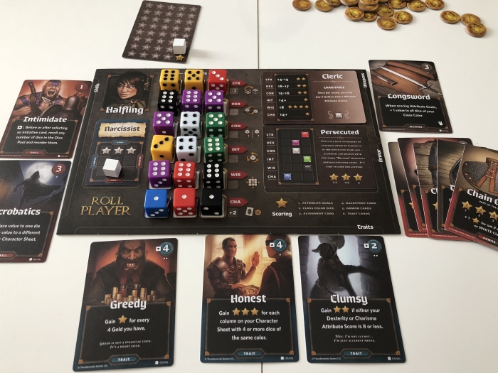 Roll Player vous propose une variante de Sagrada dans l’univers Donjons et Dragons ! je dois admettre que c’est carrément réussi. L’objectif dans Sagrada était de créer un vitrail en fonction des couleurs et des chiffres imposés à certains endroits. Ici, dans Roll Player, vous placez des dés pour faire évoluer votre personnage.