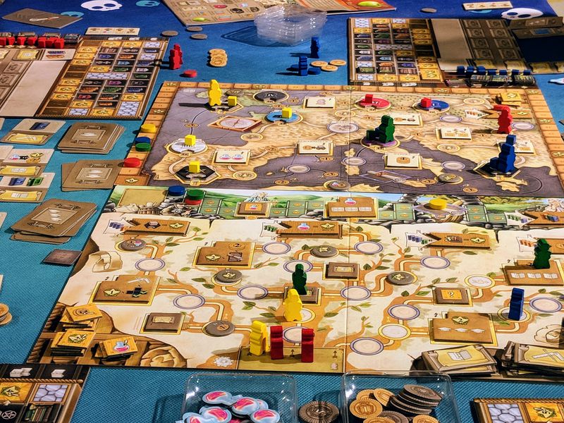 - Voyage: Cela vous permet de déplacer votre grand pion en Europe sur le plateau de voyage, de gagner de petits jetons bonus et de déposer des cubes sur les universités et autres tuiles bonus. Vous ne pouvez laisser un cube que si vous terminez votre mouvement à cet endroit. Vous risquez donc de perdre des points de mouvement tout au long de la partie. Les 8 premiers cubes placés ne fournissent aucun point, mais le 9 (1 pt), le 10 (2), le 11 (4) et le 12 (8) fournissent des points.