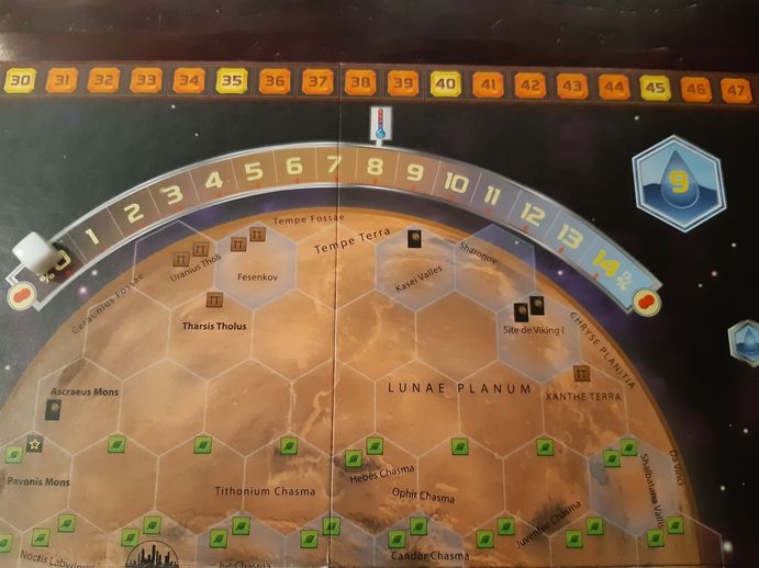 Sur les échelles température et oxygène, gardez bien en tête les bonus accessibles sur certains niveaux ! Faire progresser la température à 0 degré vous permettra de placer un océan : vous marquerez donc 2PV pour une action. Idem pour l’oxygène qui passerait à 8%. Chez nous, lorsque ces paramètres se rapprochent de ces seuils, on assiste à une séquence plus tendue, avec des tours à une action pour ne pas mettre l’adversaire dans une position favorable. Et oui, l’idée est bien de ne pas offrir cet avantage à l’adversaire… donc il vous faudra bien observer le plateau et la main de l’adversaire et jauger s’il est en capacité de monter la température ou l’oxygène : a-t-il suffisamment d’argent, ou de plante, ou de chaleur ? Bien sûr, vous n’êtes pas à l’abri d’une carte dans la main d’un adversaire qui lui permettrait d’augmenter rapidement un des paramètres.