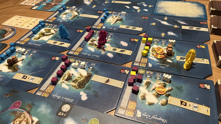 Vive la bataille ! C’est un jeu qui mélange conquête, exploration, construction de bâtiments sur les iles pour les fortifier. Ce que j’ai adoré, c’est l’amélioration des cartes et faire d’un petit capitaine, la terreur des mers ! Gestion de ressources originales (dans vos cales ou sur vos iles, attention aux voleurs) et quel délice de remplir son coffre de pièces durement gagnées en coulant les bateaux ennemis ! Le seul bémol, c’est le rendu visuel du drapeau pirate pas terrible ! Le mode pirate n’est pas très clair non plus dans les règles et peut-être mal exploité.
