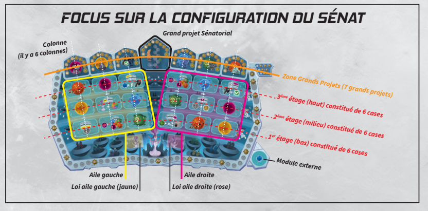 - la face ambassadeur qui permet de gagner des étages du sénat (et donc des points de victoires en fin de manche) si on est majoritaire sur la ligne / étage et qui permet aussi de faire passer les lois qui sont des objectifs de fin de manche (à droite ou gauche du sénat).