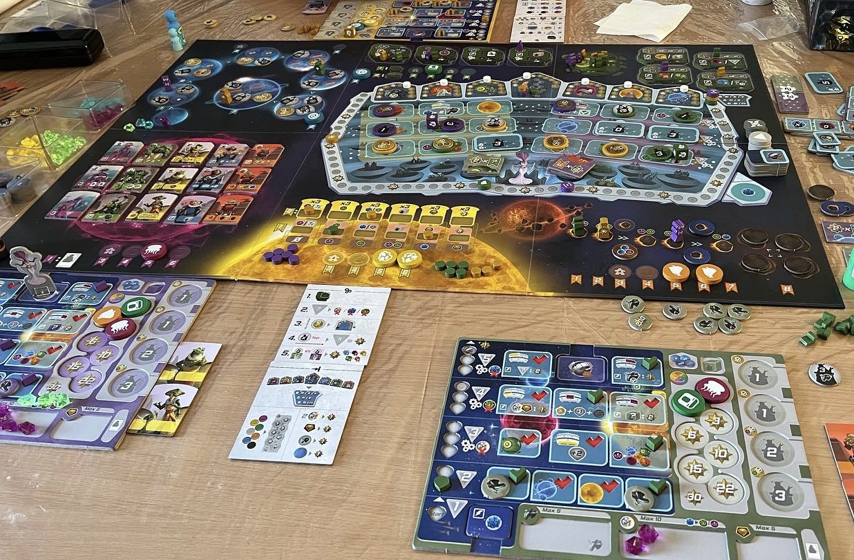 La matinée démarre en fanfare avec un jeu comme je les aime, à savoir beaucoup d’interactions. On se bat à tous les niveaux : sur les majorités (à l’horizontal et à la verticale), sur les emplacements d’actions, sur la progression des pistes des planètes, sur la rapidité à récupérer les médailles. Une jeu hautement concurrentiel en somme. Si fédération est vraiment fluide et hyper intuitif il n’en demeure pas moins un sacré casse-tête pas prise de tête. Hors de question de jouer dans son coin et puis, observer avec acuité les autres joueurs est obligatoire. Très envie d’y rejouer et d »upgrader mon pauvre score de cette partie.