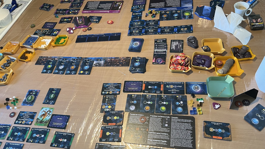 Mon Excavation Earth de cet Essen 2022. En gros, je n’ai rien compris. Je me suis mis en mode mono-neurone en attendant la fin de la partie. Je vais mettre ça sur le compte des règles qui m’ont semblé peu explicites voire cryptiques. Ceci dit, ce que j’en ai retenu du fond de la béance abyssale de ma cervelle endormie : de l’épicerie, de l’épicerie et encore de l’épicerie. Vas-y que j’ t’échange trois bleus contre six petits blancs que je transforme en 4 hexagones jaunes pour acheter une carte qui me rapportera un demi point de victoire… Sans compter la pléthore de cartes jouables chez les uns et chez les autres mais vu qu’il y en a tellement sur la table tu sais même plus quoi faire. Pfff ennui.