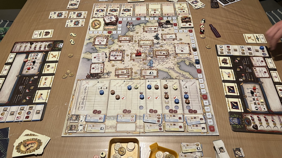 Côté gameplay : avec un 3,1 de difficulté sur BGG, je m’attendais à un jeu un peu plus exigeant même si la réflexion est présente. Les mises en place de mécaniques connues comme le marché décroissant de cartes, le voyage à travers l’Europe voire l’effet de majorité sur la partition (malgré une petite confusion due à une lecture trop rapide liée à la fatigue) n’est pas pour me déplaire mais je me suis senti un peu trop limité dans mes actions, contraint par le tirage de ses cartes, soumis à un hasard d’arrivée des objectifs lorsque plusieurs sont acquises durant un manche.