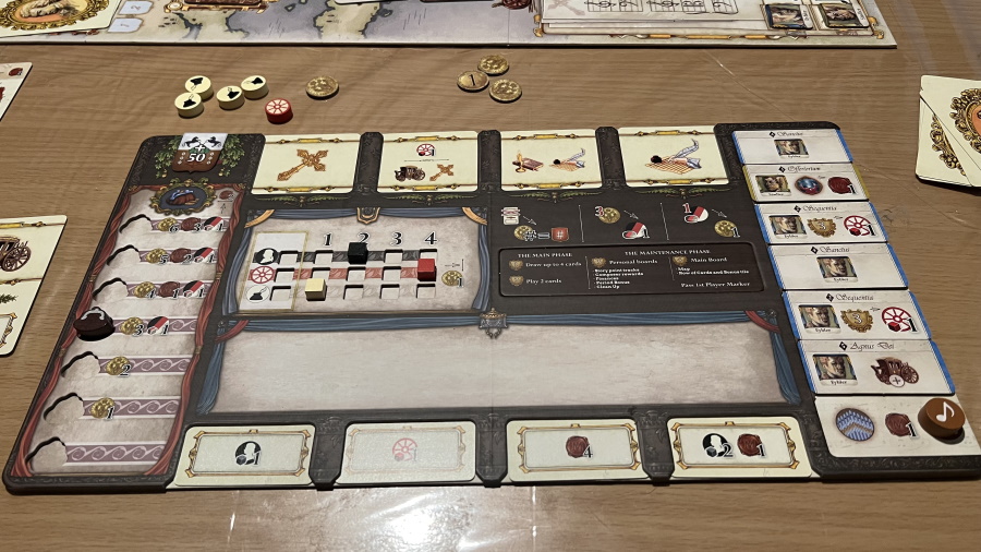 Côté matériel : c’est un grand bravo, en particulier pour le plateau en double épaisseur qui permet de positionner parfaitement la bourse de revenu, les compétences et les cartes jouées que l’on insère avec un petit bémol pour les cartes du dessus qui nécessitent d’être plutôt délicat pour les retirer en fin de manche. Sinon pour le reste, rien à dire à part la partie de Constance qui nous a un peu déçu par la présence de ces jetons soupir un peu too much qui finalement a entraîné un désintérêt de la carte.