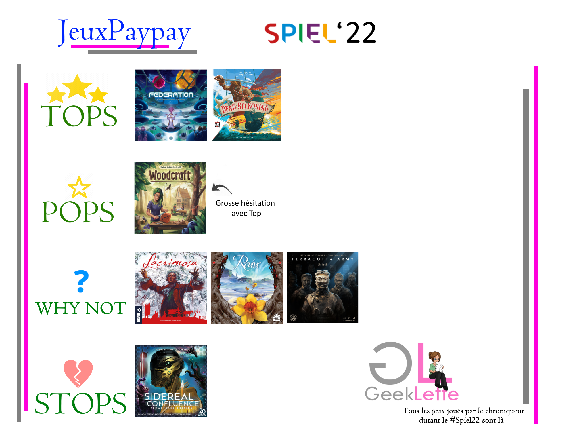 Pour rappel, nous, sur Toulouse, n’avons pas été à Essen, c’est la Team Nord qui nous a envoyé les jeux précommandés d’Essen (merci à eux). On a donc du faire une pré sélection en fonction du budget aussi. Et on a pris ZERO risque sur les jeux car l’an dernier nous avions passé 5 jours épuisants sur des jeux qui ne nous ont pas convaincus. Cette année, on voulait s’éclater et c’est réussi. Le top 30 du Spiel22 ne tombe pas du ciel non plus, ce sont des jeux qui ont su convaincre sur le papier (règles) et visuellement.