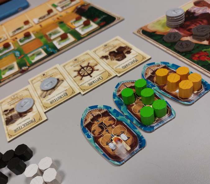 - Le Capitaine, qui permet de choisir un bateau puis d’y mettre le maximum de barils possible d’un seul type de marchandise (maïs, fruit, sucre, tabac ou café). Chaque baril ainsi posé rapporte 1 point de victoire. Les joueurs continuent de remplir les bateaux tant que cela est possible sachant que chaque embarcation doit contenir un seul type de marchandise et que celle-ci doit être différente de celle des autres bateaux… ajoutez à cela que les places sont très limitées… Et qu’advient-il des barils qui n’ont pas pu embarquer ? Ils retournent tous dans la réserve générale à l’exception d’un seul par joueur ! Celui qui a sélectionné le Capitaine, gagne 1 point de victoire de plus.