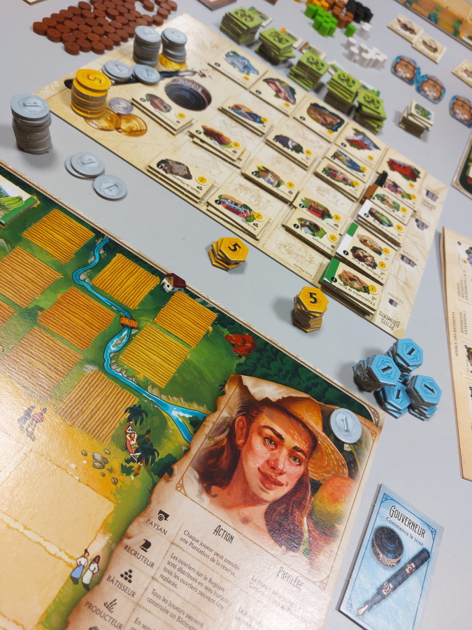 - Le Paysan, qui permet de récupérer un jeton plantation parmi ceux disponibles et de l’ajouter à son plateau personnel. Attention cependant, pour être exploitées, ces cultures auront besoin d’ouvriers et d’un bâtiment industriel adapté (le maïs faisant exception). Le privilège du joueur sélectionnant le Paysan est de choisir, à la place des plantations classiques, une carrière. Celle-ci lui permettra de réduire d’un pesos le coût de ses achats de bâtiments.