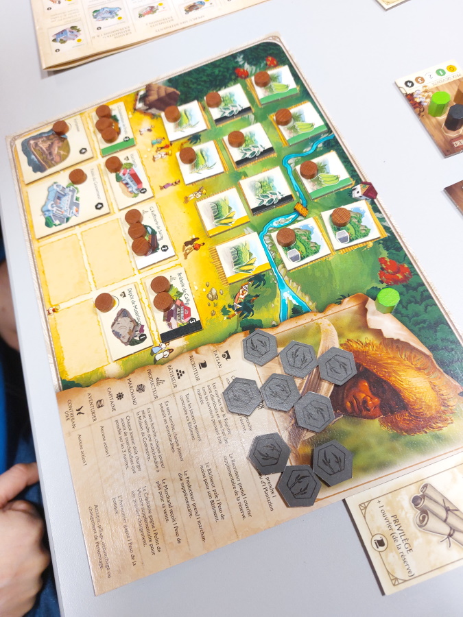 - Si un joueur est le 1er à obtenir 3 plantations du type sélectionné en début de partie, il remporte immédiatement 3 ouvriers qu’il place sur son plateau (mais ne les attribue pas encore à ses bâtiments et/ou plantation).