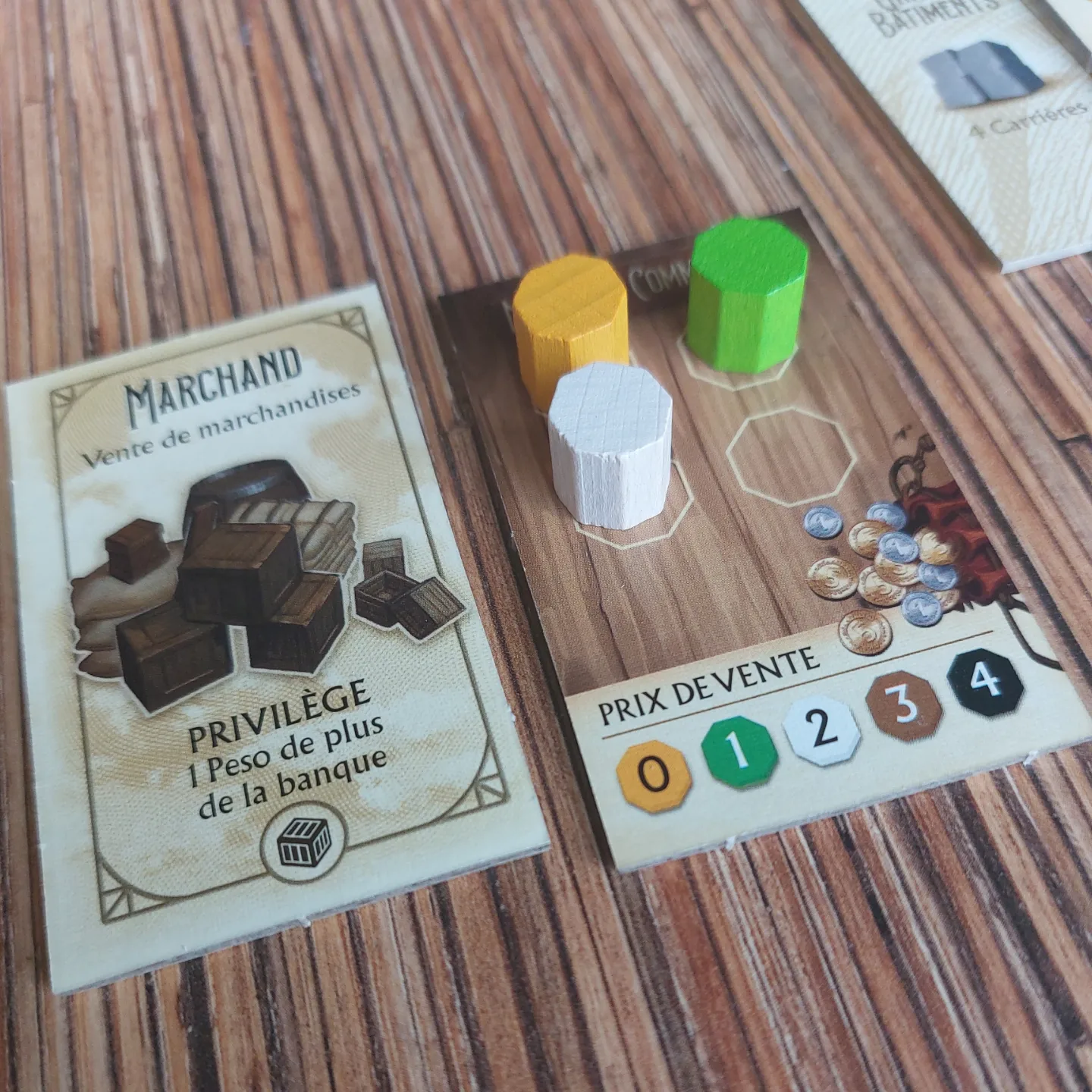 - Le Marchand, qui permet de vendre un seul baril de ses marchandises en fonction d’un prix fixe. Par exemple, le maïs est vendu pour zéro peso (oui, oui, zéro !) alors que le café s’échangera contre quatre pesos de la banque. Il n’y a que 4 places disponibles dans la Maison du Commerce et dès qu’une marchandise y est placée, elle ne peut plus y être vendue. Celui qui sélectionne ce rôle vend sa marchandise pour 1 peso de plus.