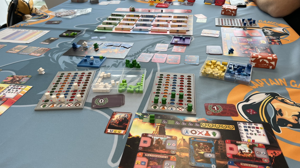 Nous avons fait 6/7 manches sur 9 en une heure. Donc le jeu est très court pour un jeu de civilisation mais ça tourne, c’est malin, rapide, voire presque addictifs.