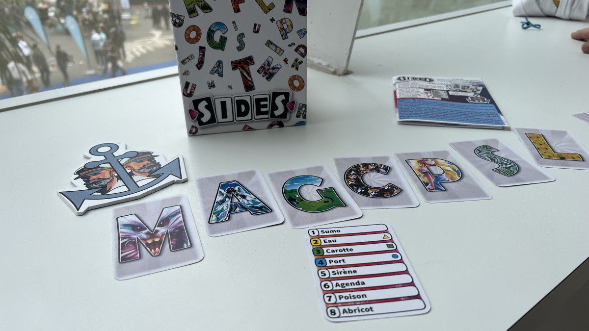 A retrouver chez Captain Games aussi, Sides. Très surprise du jeu. Les joueurs doivent faire deviner à un autre joueur un mot. Mais pour ça ils ne peuvent utiliser qu’une lettre qui se trouve sur les extrémités. Le mot doit commencer par cette lettre. On enchaine les mots sans regarder le temps qui passe.