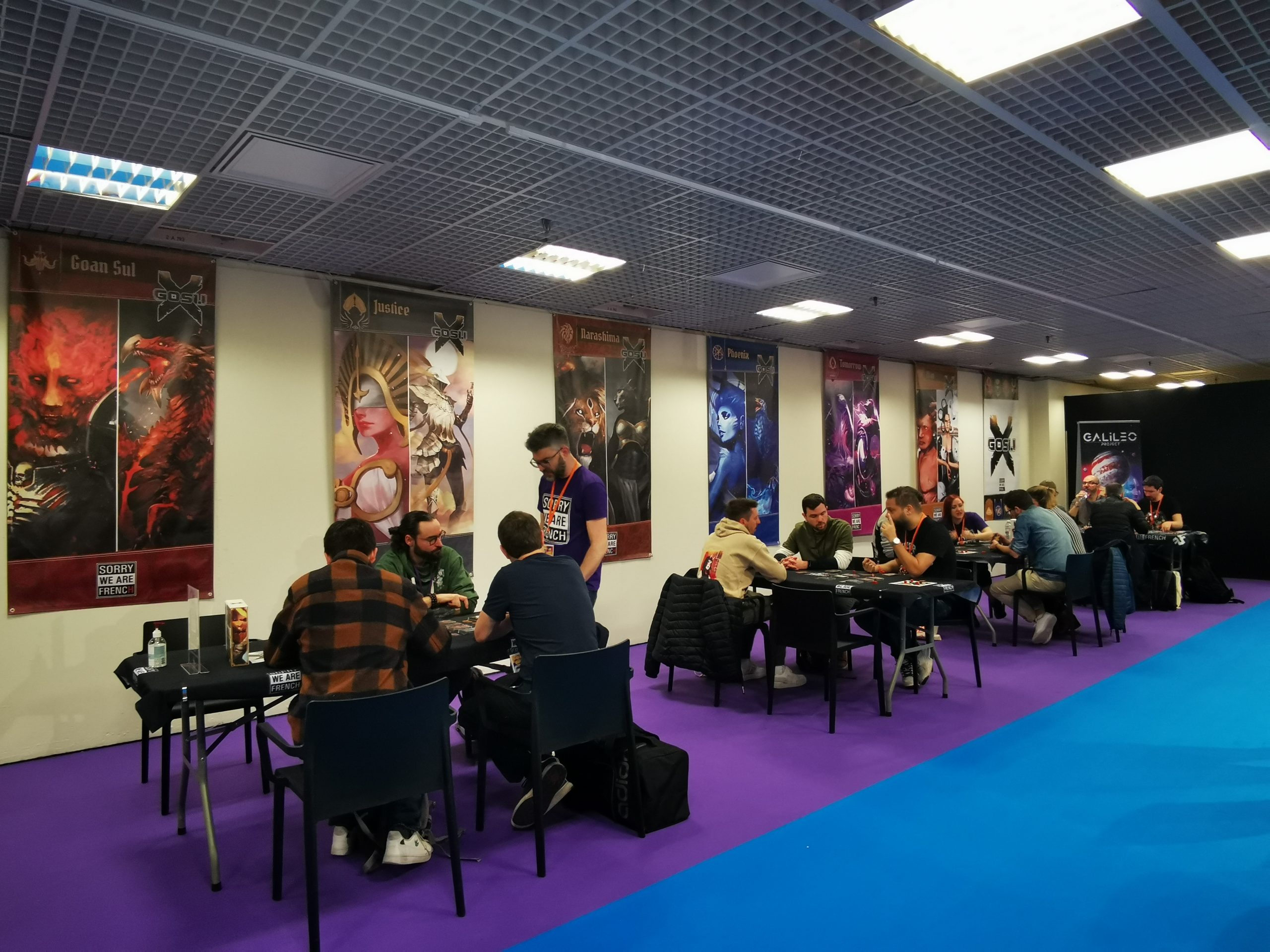 - L’espace dédié aux Jeux de Rôle / Jeux de figurines est très accueillant avec les baies vitrées qui apportaient de la luminosité et une vue splendide (pour ne rien gâcher). Un peu isolé car on doit passer par le coin famille pour l’atteindre mais clairement cet espace supplémentaire était nécessaire, merci aux organisateurs. (Vous pouvez le voir sur la photo ci-dessus : d’ailleurs il y avait encore des boites d’Hybris… ça n’a pas duré… lol)