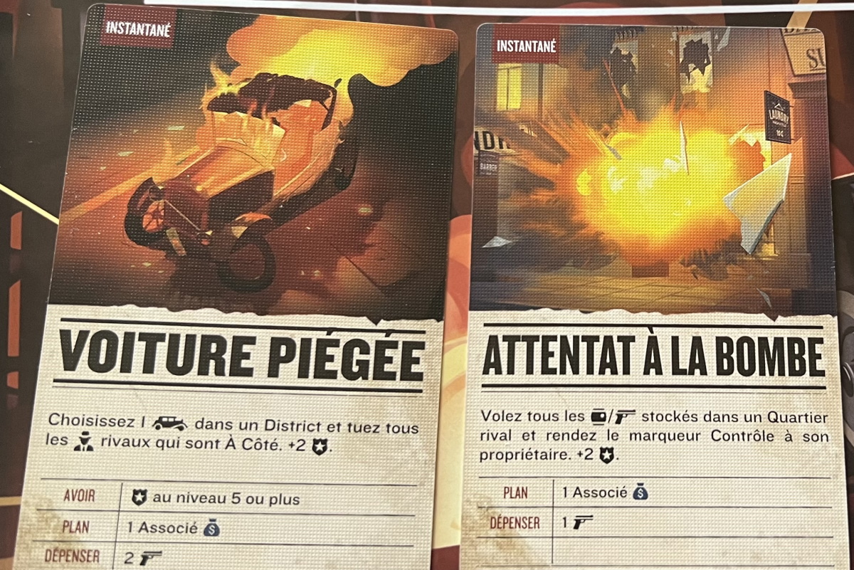 - Vous emparer d’un quartier : par la force (vous compterez vos figurines, vos voitures + la force dans vos cartes jouées) pour renverser un quartier et le faire vôtre. Ca c’est pour les braves !
