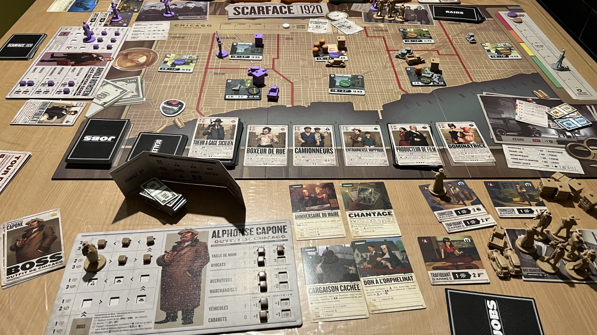 Dans beaucoup de jeux de gestion, on entend : passe moi du bleu, du rouge… ici : je vends des flingues et avec les flingues qu’il me reste, je peux tuer un de tes hommes. On est dans le thème du début à la fin, la tension monte de tour en tour et les crasses qu’on se fait doivent être saluées et vengées plutôt que d’être blâmées. Une fois que ces règles sont comprises par les joueurs, Scarface 1920 s’avère être un des meilleurs jeux de ce genre ! Au travers d’un mécanique mi deck building mi pose d’ouvriers mi dépense d’actions, le jeu vous transporte dans un thème dont votre seul sang froid vous permettra d’en sortir vainqueur.