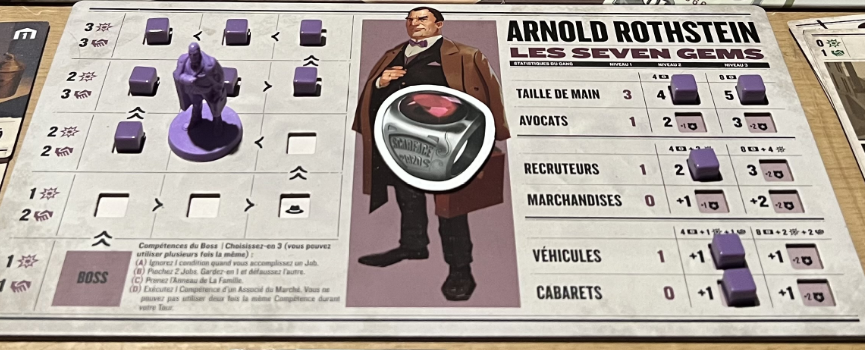 • selon l’amélioration de votre gang, votre boss aura plus ou moins de force et d’influence (comme vous voyez sur mon plateau en fin de partie, mon boss était à 2 en force + 2 en influence).