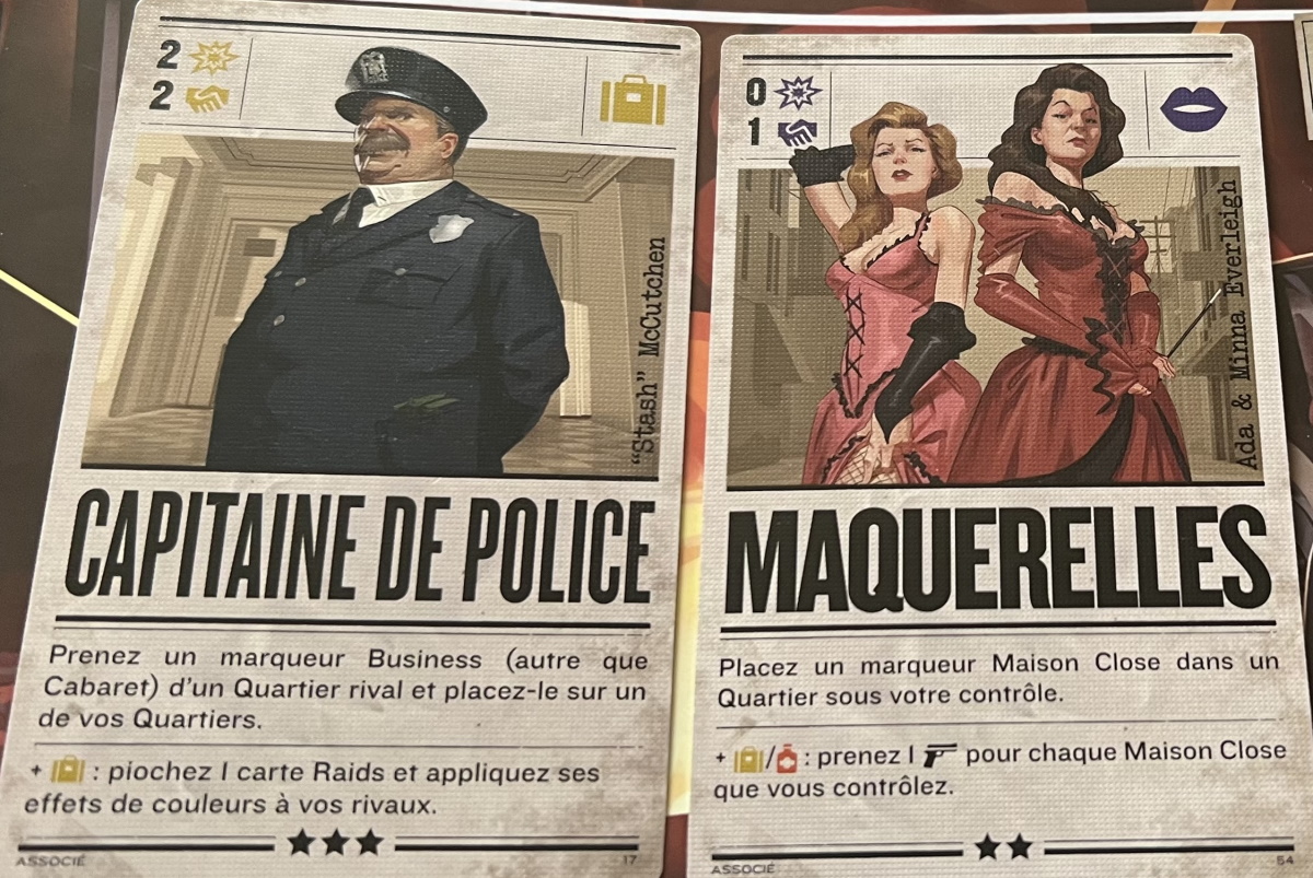- J’ai apprécié les cartes ‘bras droit » qui se débloquent au fil de l’upgrade du boss, on a tous les mêmes et ce sont CES cartes que vous attendez à chaque partie. Ne les cherchez pas dans le deck des associés à engager (la rivière), elles sont là, présentes pour tous lorsque vous améliorez le gang à certains moments.
