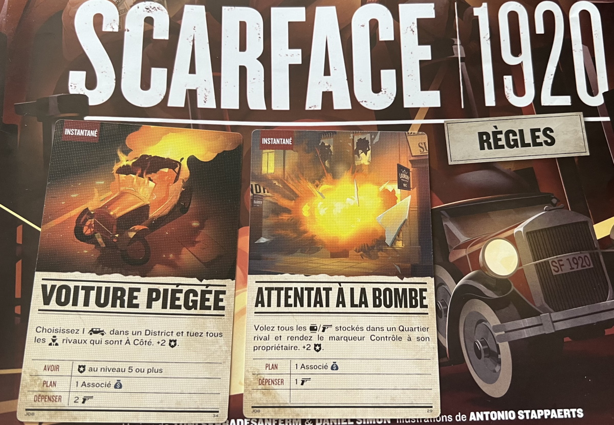 Je conçois que le jeu ne soit pas pour tout le monde, d’ailleurs pour ceux qui aiment maitriser / contrôler leur partie du début à la fin, n’ouvrez même pas la boîte. Ici règne le chaos et puis soyons honnêtes, le choc est grand à chaque attaque qui vous cible. Mais Scarface 1920 se veut comme ça et assume totalement l’anarchie de chacune des parties. Peut-être qu’avec le temps et l’endurance, on arrivera à éviter les tirs en jouant mieux (courbe de progression) mais en tous les cas, on s’en prend toujours plein la tronche et on jubile à l’idée de se venger. Le premier à ouvrir les hostilités va engendrer une guerre de gangs sans précédent ! Je le trouve plus violent que le Parrain par exemple car vous perdez BEAUCOUP à Scarface. Il me rappelle plutôt « Exodus », vos modules pouvaient être détruits par les adversaires et vous commenciez votre tour avec RIEN. Et bien là, c’est pareil, chaque coup de p… vous met dans un état second où vous ne pensez qu’à vous venger lol